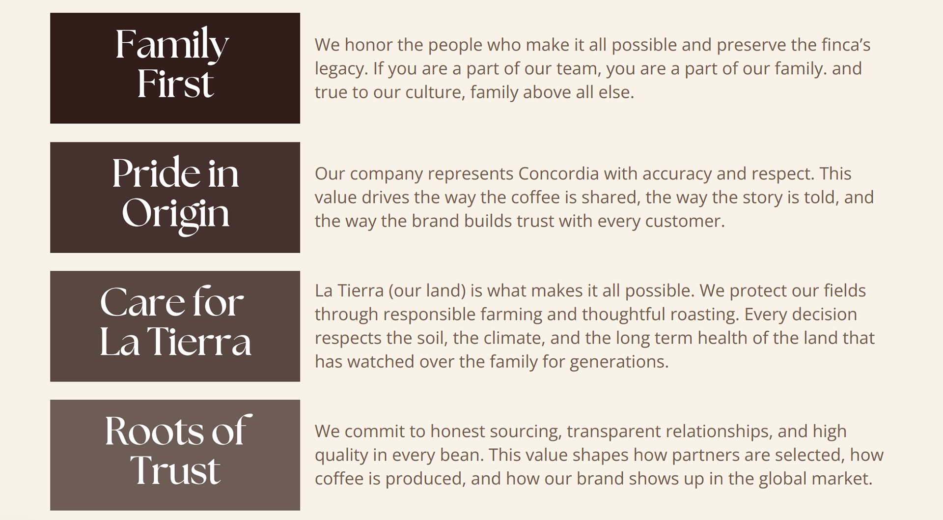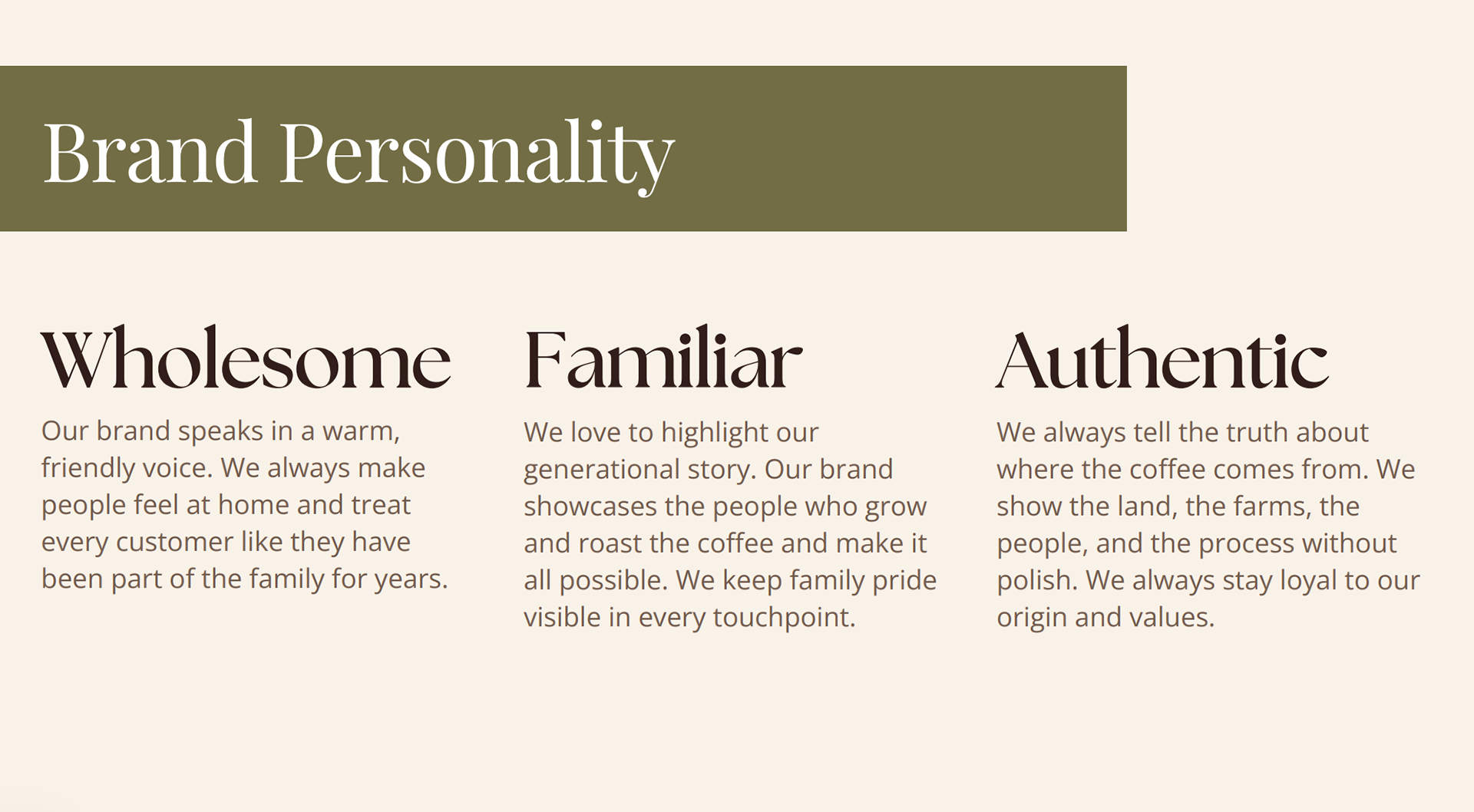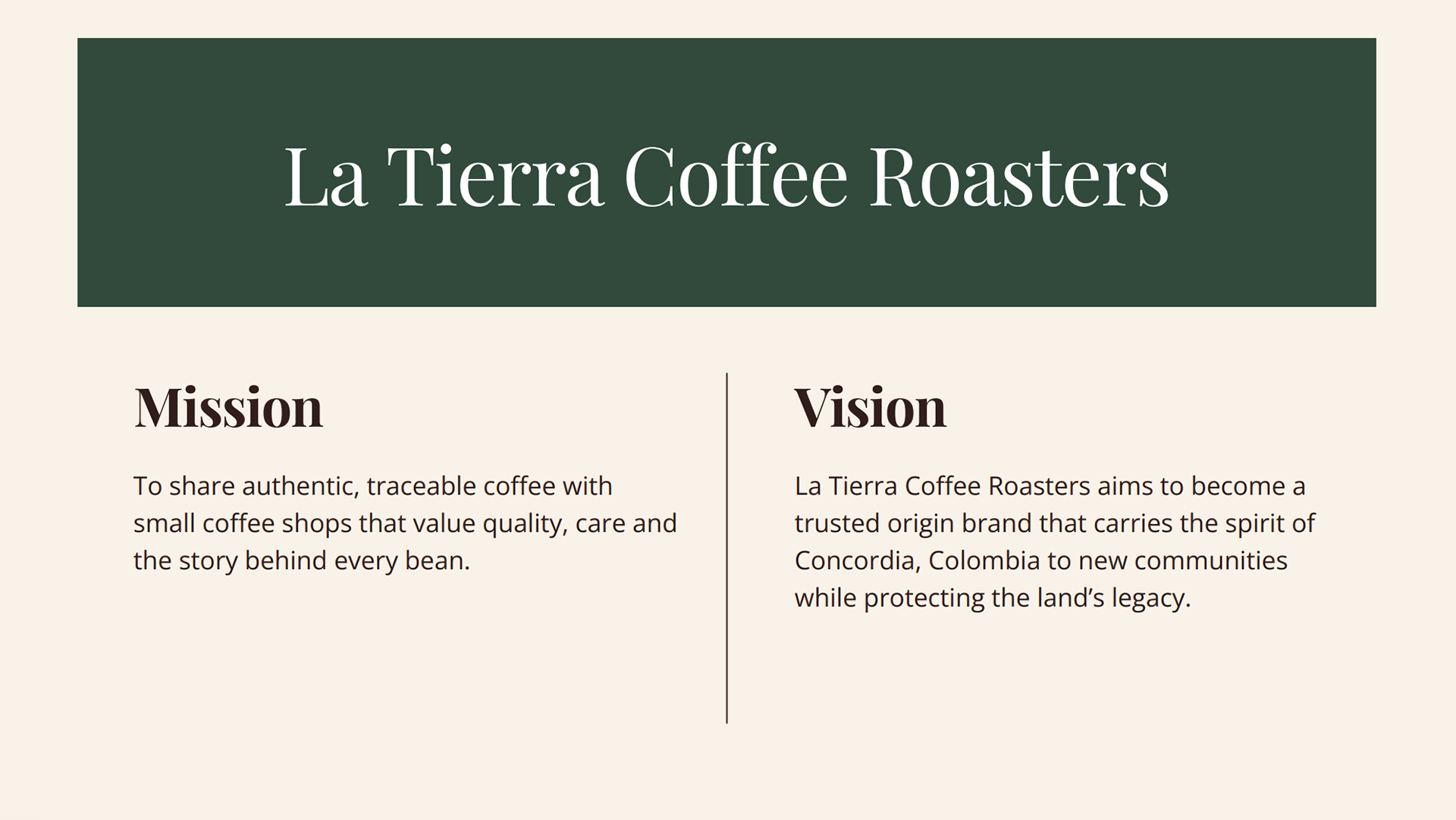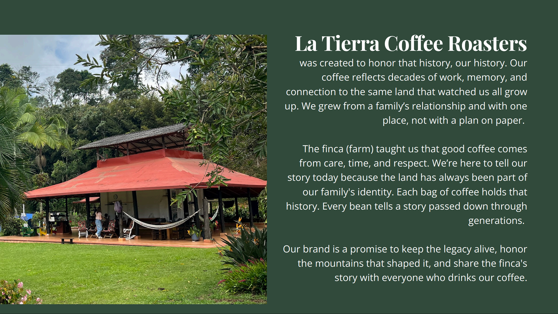 La Tierra Coffee Roasters is a conceptual single-origin coffee brand inspired by generational coffee farming in Concordia, Colombia. Rooted in family history and pride in origin, the brand honors the land, the people who care for it, and the story behind every bean. This project allowed me to draw on my Colombian background while translating cultural identity into a strategic, visually cohesive brand. I developed the brand from initial concept to full presentation, including mission, vision, brand story, core values, buyer persona, positioning strategy, visual identity system, and real-world applications. The strategy targets small, community-focused coffee shop owners who prioritize transparency, quality, and authentic sourcing over mass production. Every design choice was intentional. The earth-toned color palette reflects the Andes landscape, the serif typography reinforces heritage and tradition, and the imagery guidelines center on real hands, real land, and real process. This project demonstrates my ability to build a brand from the ground up, combining emotional storytelling with research-driven positioning and a complete visual system that feels both personal and strategic.