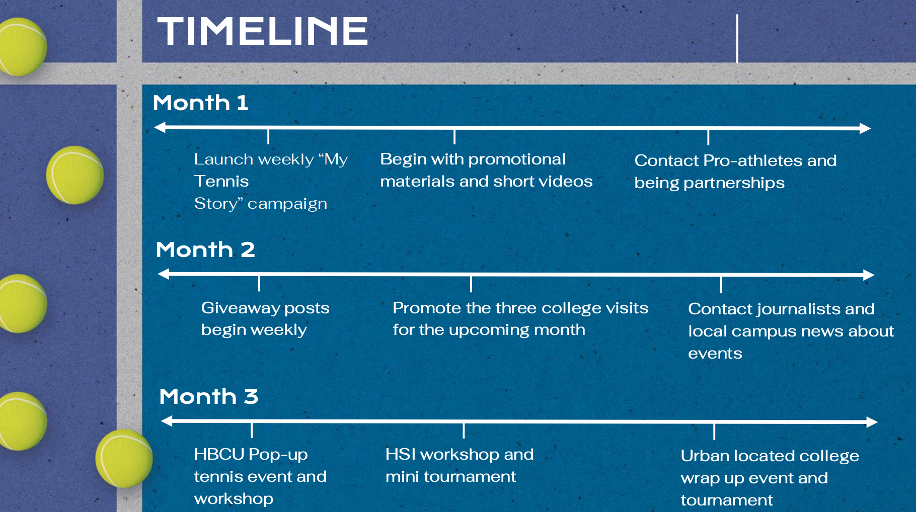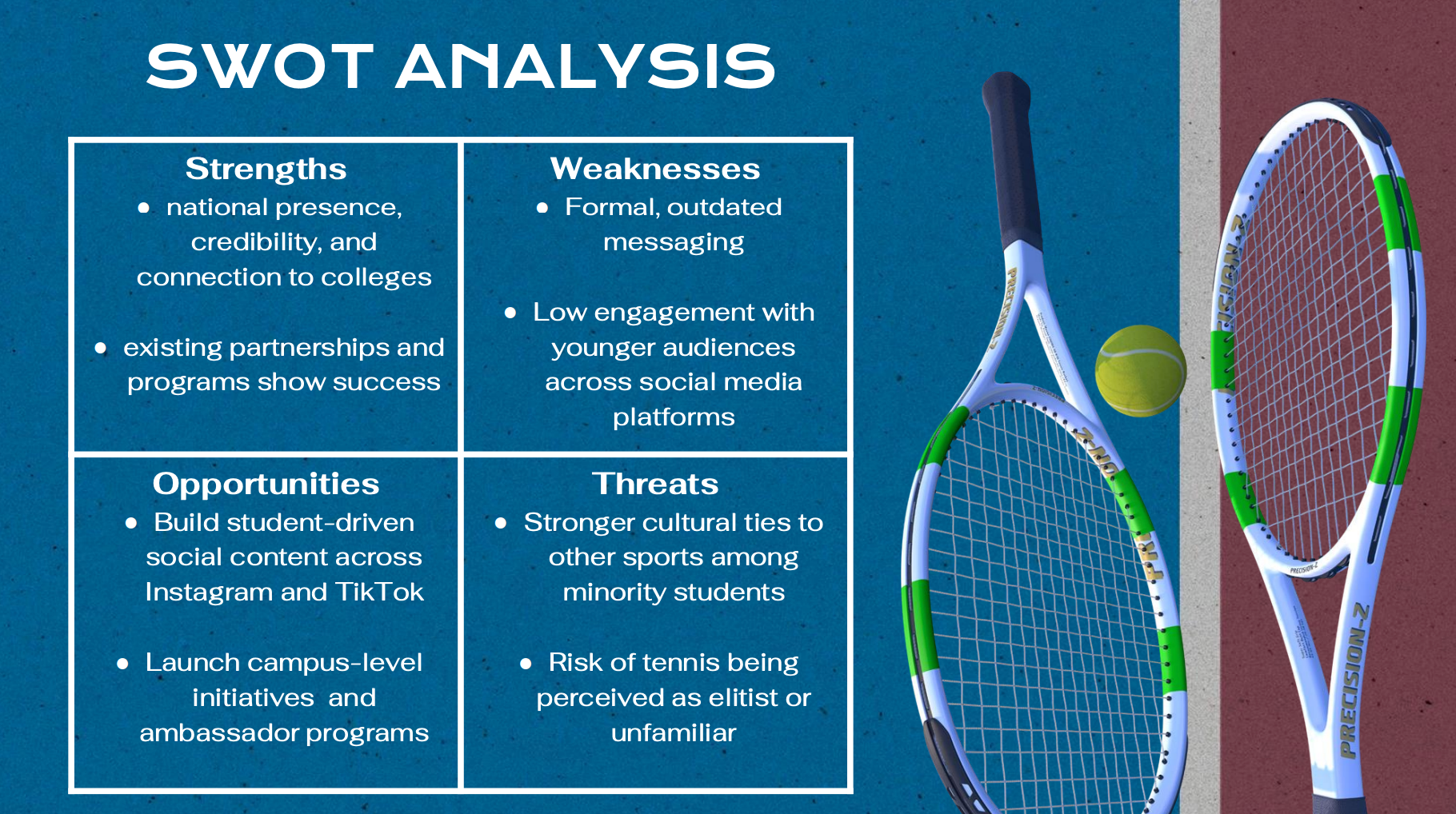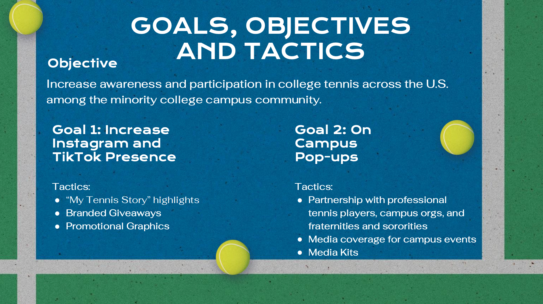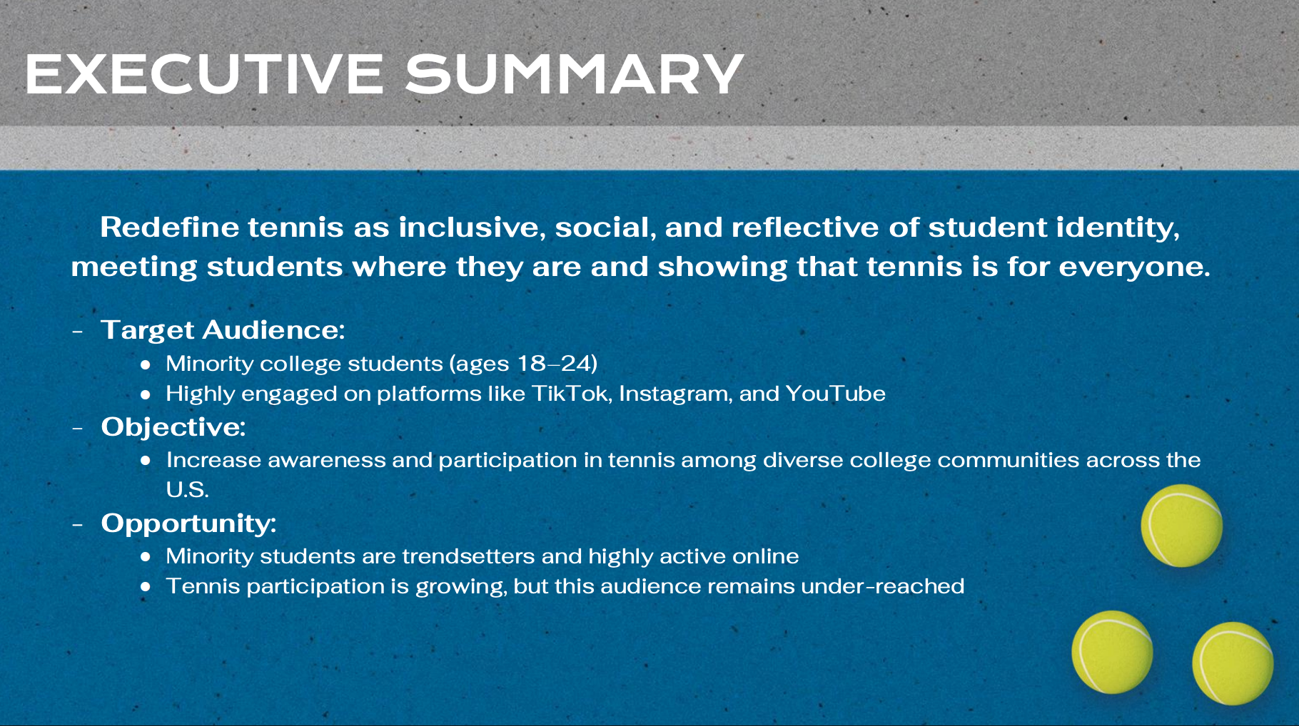 The proposal outlines clear objectives, measurable goals, and actionable tactics, including a student-led social media campaign and on-campus activations at HBCUs, HSIs, and urban universities. The strategy reframes tennis as accessible, social, and identity-driven rather than elite or distant. This project reflects my approach to strategy: people first, research-led, and rooted in cultural awareness.