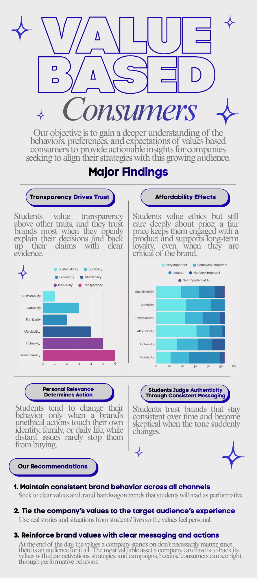 This project explores how college students respond to values based brand messaging and how perceptions of authenticity shape consumer behavior. Our team conducted original research using a Qualtrics survey of Elon University students and analyzed how values such as transparency, affordability, sustainability, and inclusivity influence purchasing decisions. Using Target’s DEI rollback as a case study, we examined how inconsistent brand actions affect trust, perception, and loyalty among Gen Z consumers. The findings revealed a clear value behavior gap. While many students react negatively to performative messaging, those reactions do not always lead to changes in buying habits unless it personally impacts them. This project highlights the need for brands to align their messaging and actions with their values. It's also a great representation of my interest in research-led strategy and understanding how audiences think, not just how they respond.